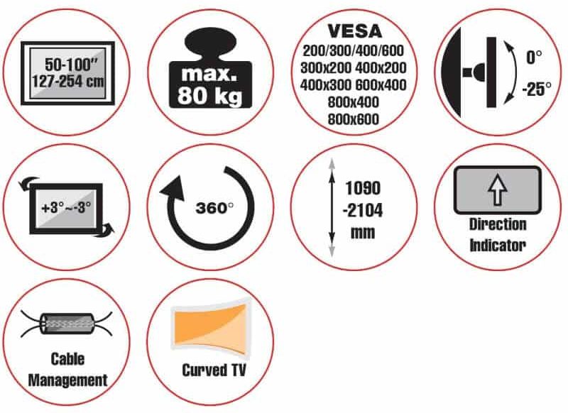Il PALLAS 100-8060T supporta facilmente schermi fino a 100 pollici e pesi fino a 80 chilogrammi. Il supporto deve questa eccezionale capacità di carico alla sua robusta struttura in acciaio e ai rinforzi strutturali.
