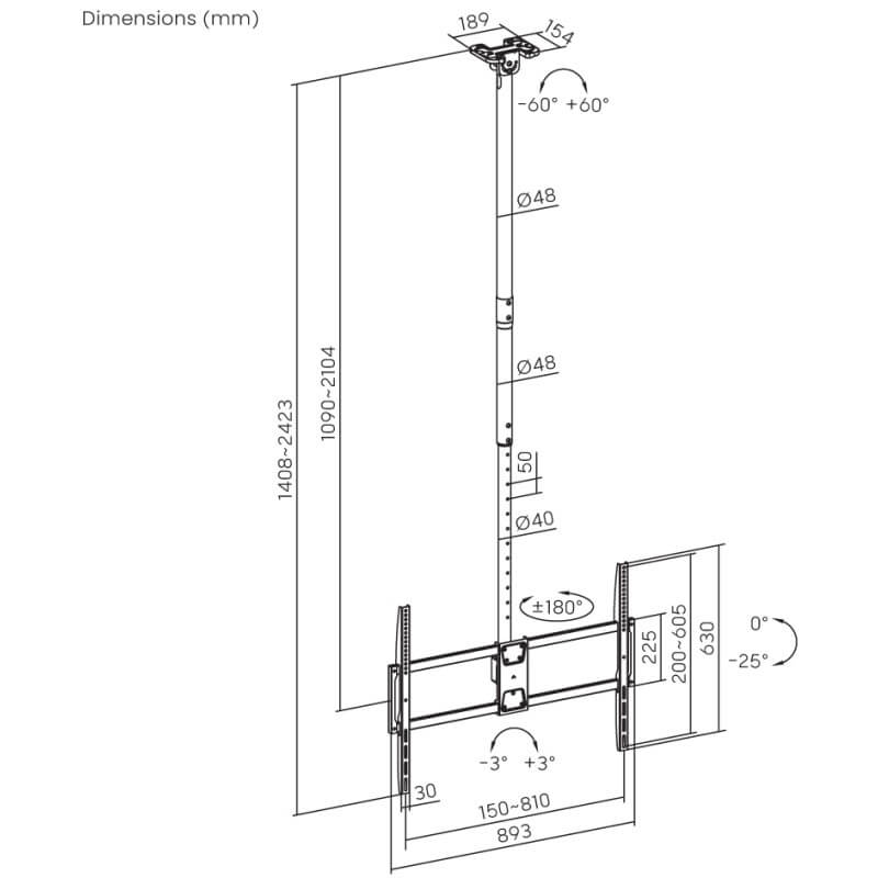 PALLAS 100-8060T super resistente, pensato per TV 50″-100″ con peso massimo 80 kg. Adatto per l’installazione su soffitti piani o inclinati e dispone di aste telescopiche per diverse esigenze di altezza. VESA da 200×200 a 800×600 millimetri.