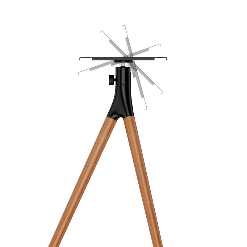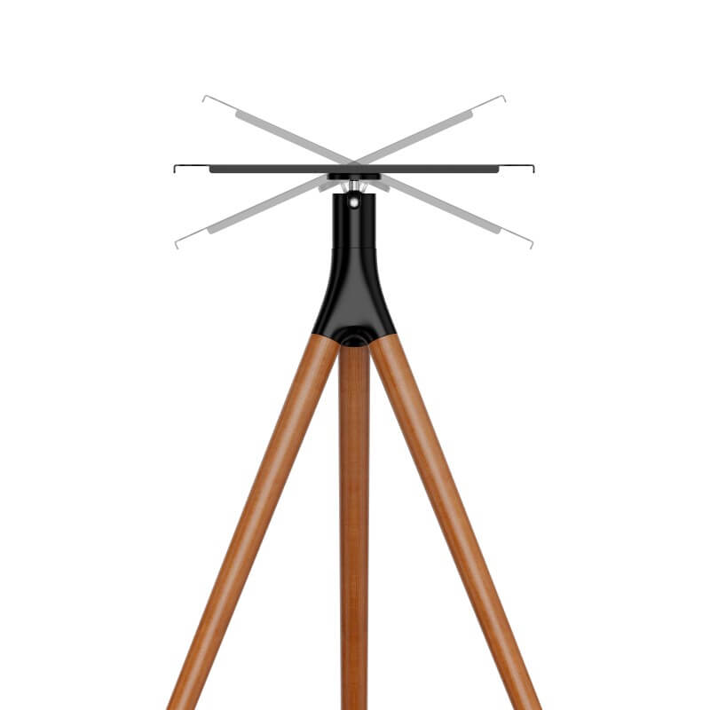 La combinazione di metallo e legno di noce crea un equilibrio tra la fredda precisione e il calore accogliente. Le venature del legno si integrano armoniosamente nei concept di interior design esistenti e conferiscono un tocco organico agli interni moderni. Negli ambienti luminosi, il supporto funge da accento di calma, mentre negli ambienti più bui, la profondità del suo materiale enfatizza il carattere dell’ambiente. Questo lo rende un oggetto che non solo attira l’attenzione sulla proiezione, ma diventa anche parte integrante dell’atmosfera della stanza.